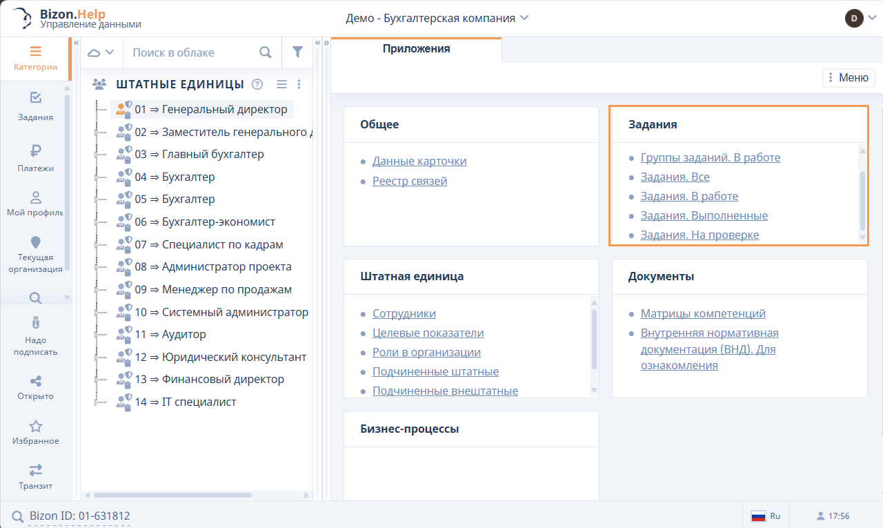 Для типа элемента «Штатная единица» добавлены приложения «Задания. На проверке» и «Задания. Выполненные» (со статусами «Выполнено» и «Выполнено без проверки»).