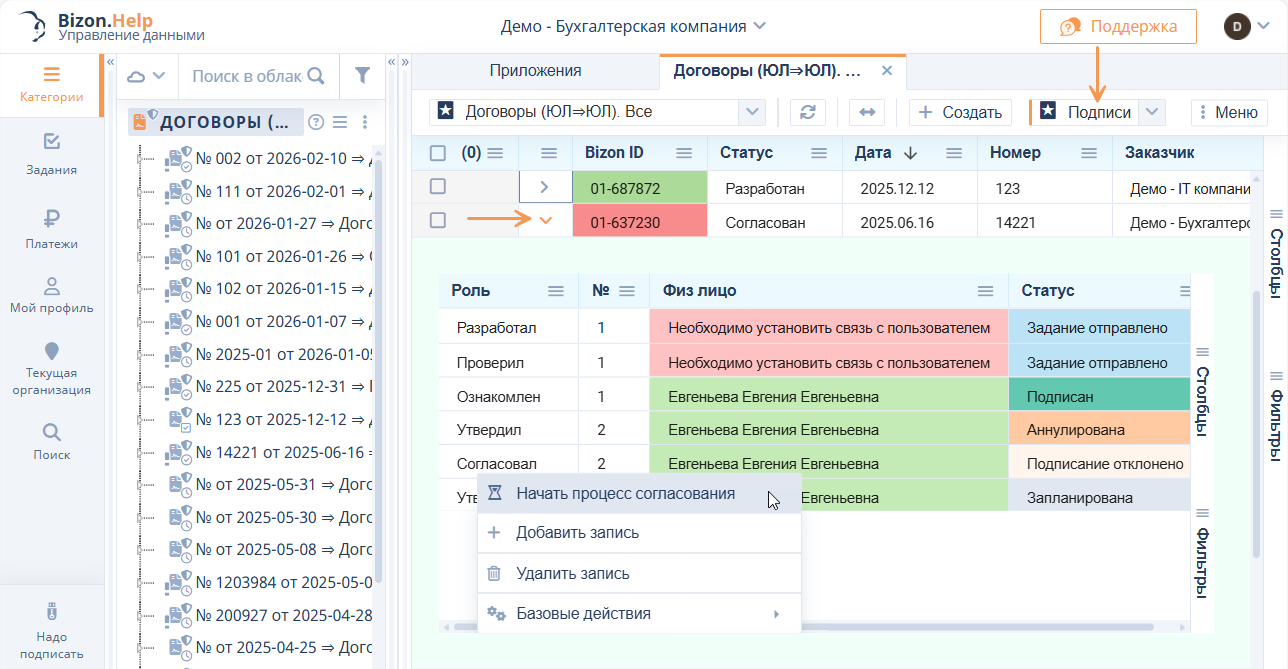 Добавлено приложение второго уровня «Подписи», содержащее основной функционал: подписание, запуск процесса согласования, выдача заданий, удаление подписей.