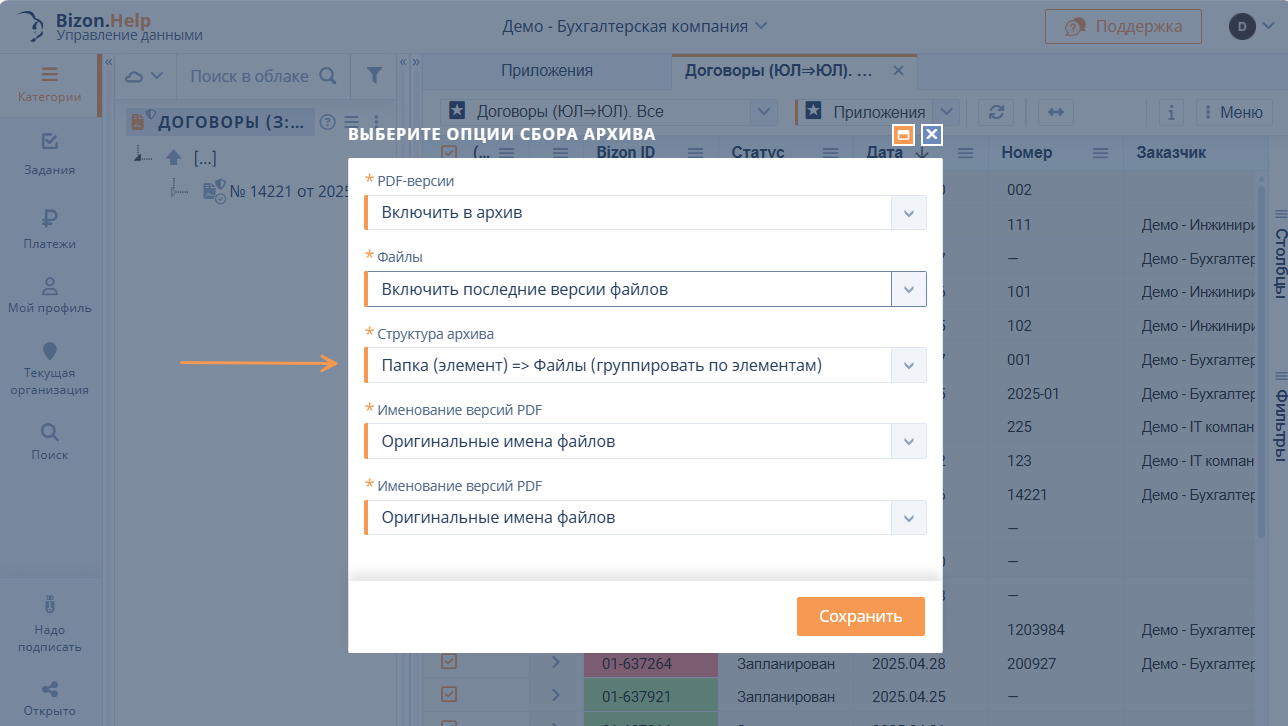 - Для нового функционала сбора файлов в архивы добавлен способ организации структуры архива «Папка (элемент) ⇒ Файлы (группировать по элементам)».