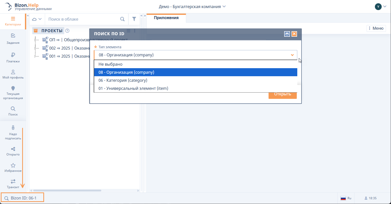 - В Footer Bizon ID расширен функционал поиска элементов по коду, в частности, добавлены категории и организации.